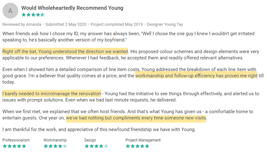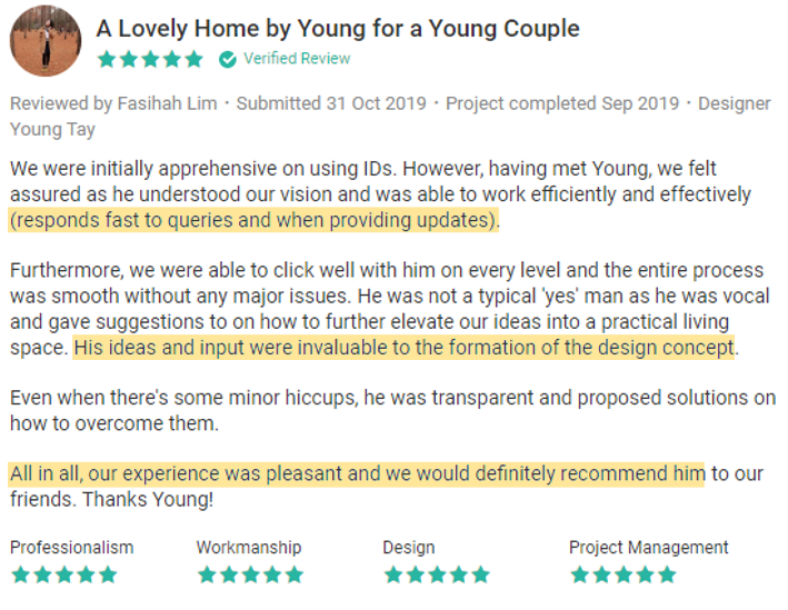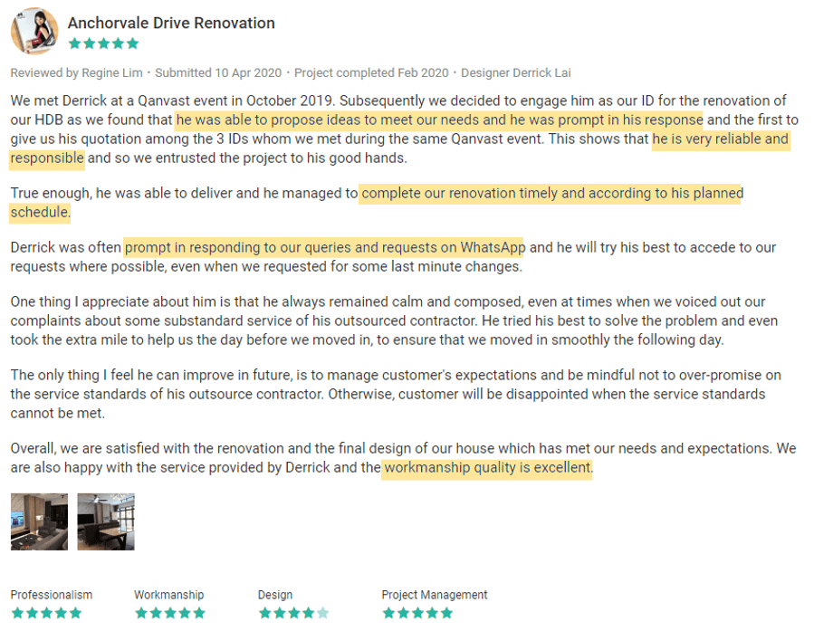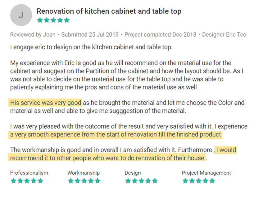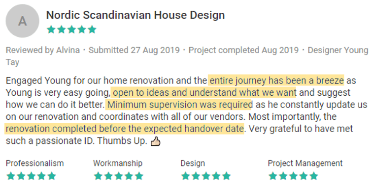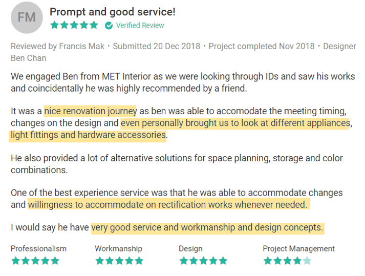 During the reno, Eric constantly kept us updated with photos of the progress. There were several times when I made last minute changes but Eric was very patient. He would give us some time to make a decision and when he knew I’m in a dilemma, he would give advice based on his experience and functionality. He also gave us valuable feedback on what furniture would fit (e.g colour & size). He was also responsive to our concerns and any defects or request even after the project was completed. The carpentry workmanship was excellent.